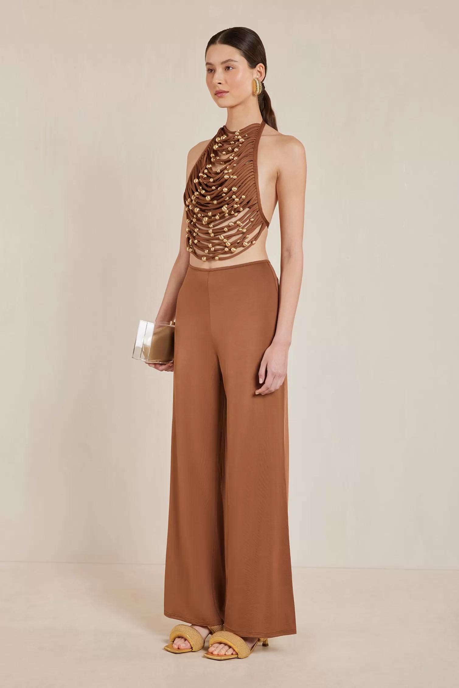 The Jonna Top is a classic, exposed halter silhouette, but full of innovative details. The dress is composed of tangled cording that is accented by gold-toned beading. The open back features a tie behind the neck and at the low back for extra effect and adjustable fit. Pair with the Kora Pant.
