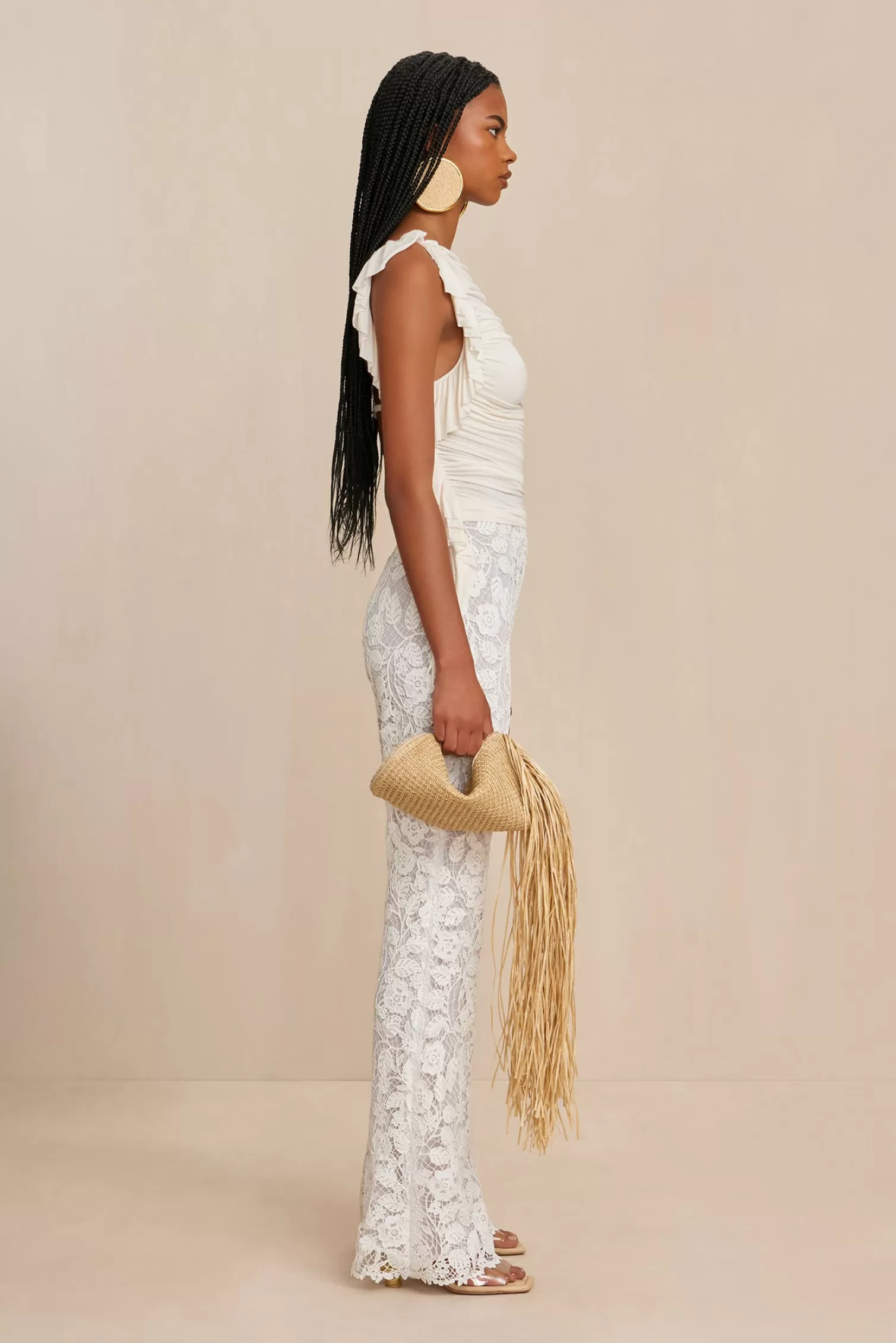 A gathered, sleeveless top with a straight neckline and ruffled fringe on the sides with an open back.