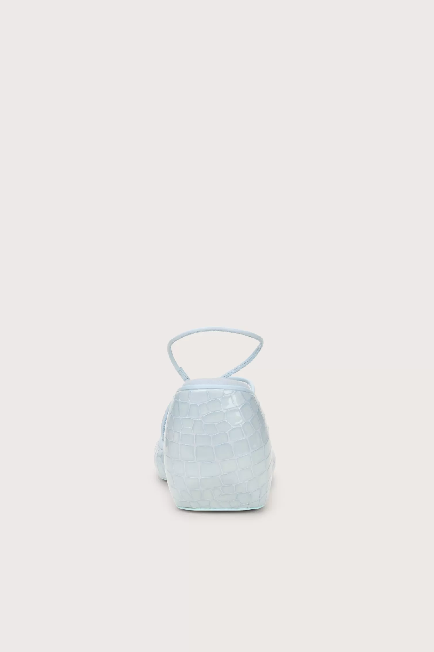 A sculptural wedge in embossed patent leather with thin straps.